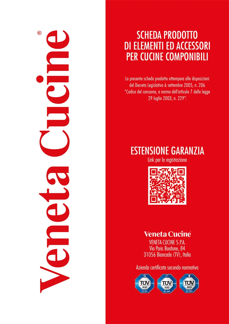 La Garanzia Convenzionale copre esclusivamente gli elementi di produzione di Veneta Cucine (basi, pensili, colonne, piani lavoro, mensole, schienali e pannelli vari).